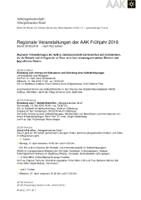 Finden Sie hier eine Übersicht der regionalen Veranstaltungen der AAK im Frühjahr 2016 – aufgeführt nach PLZ. Die regionalen Veranstaltungen der AAK Frühjahr 2016 als PDF – Download hier